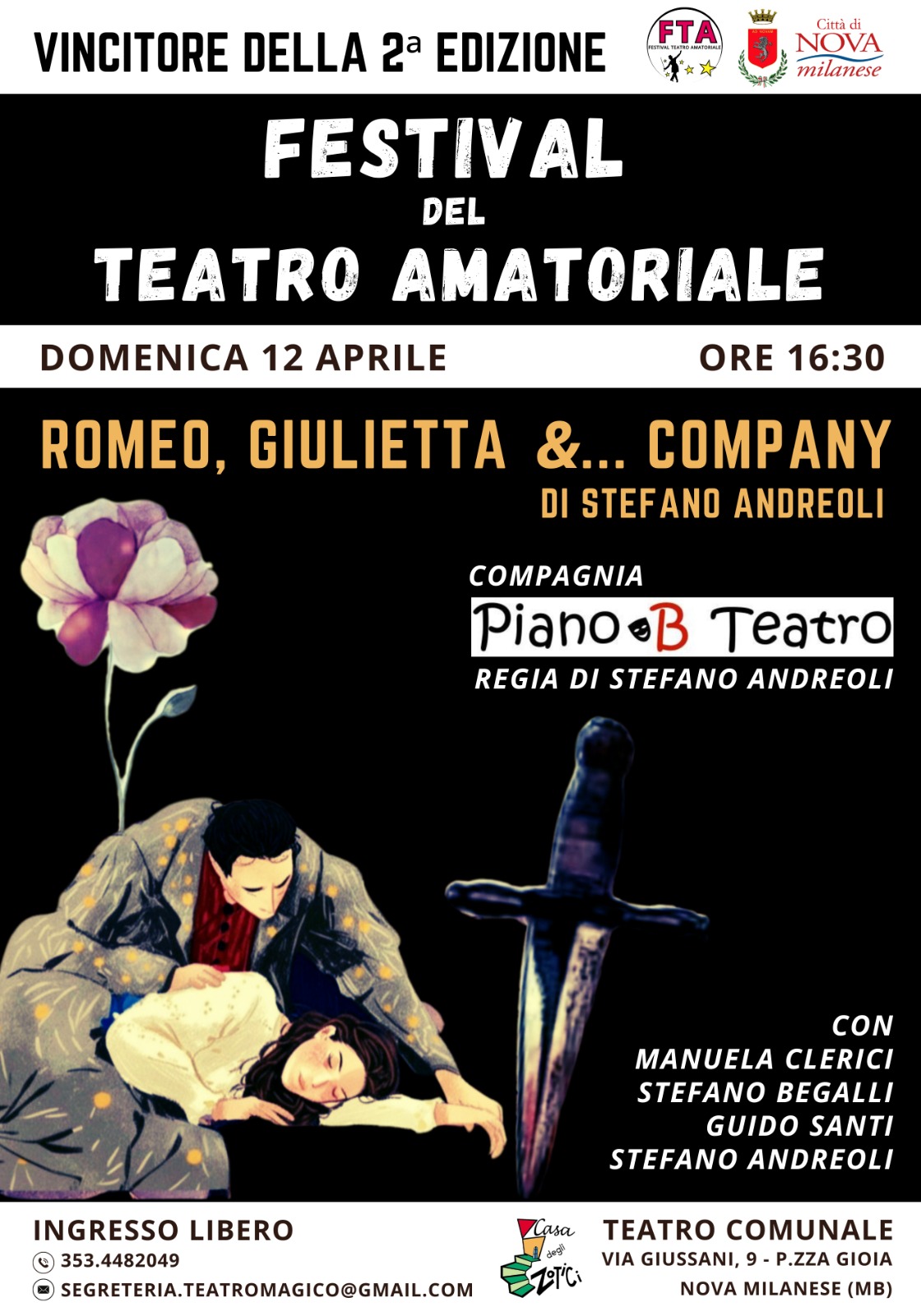 Domenica 12 aprile, alle ore 16.30, al Teatro Comunale, la compagnia Piano B Teatro, vincitrice della seconda edizione del Festival del Teatro Amatoriale, presenta “Romeo Giulietta &...Company” di e con Stefano Andreoli, Manuela Clerici, Stefano Begalli, Guido Santi.