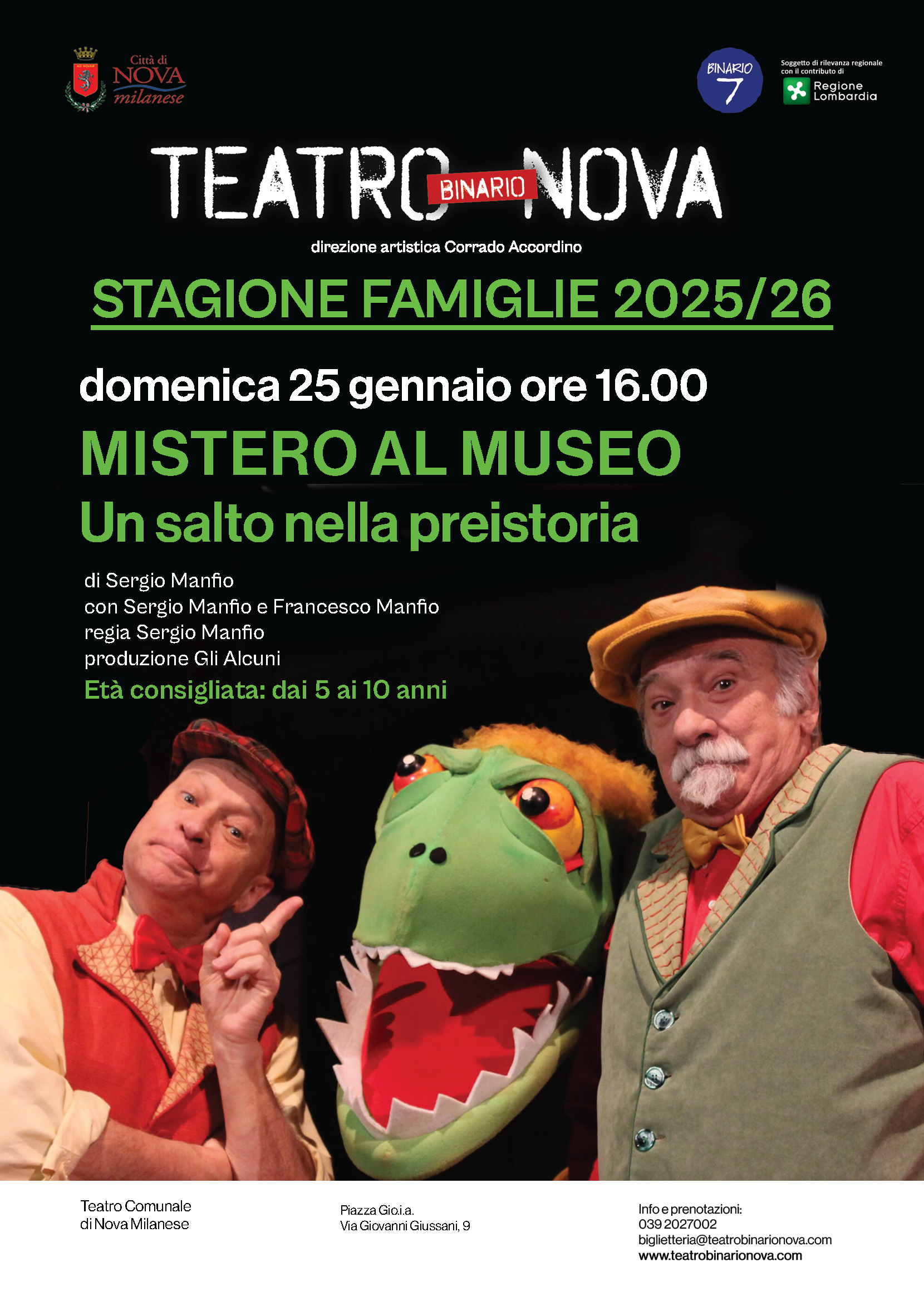 Domenica 25 gennaio, alle ore 16.00, al Teatro Binario Nova va in scena uno spettacolo pensato per famiglie e bambini dai 5 ai 10 anni: “Mistero al museo. Un salto nella preistoria”, testo e regia di Sergio Manfio, con Sergio e Francesco Manfio.