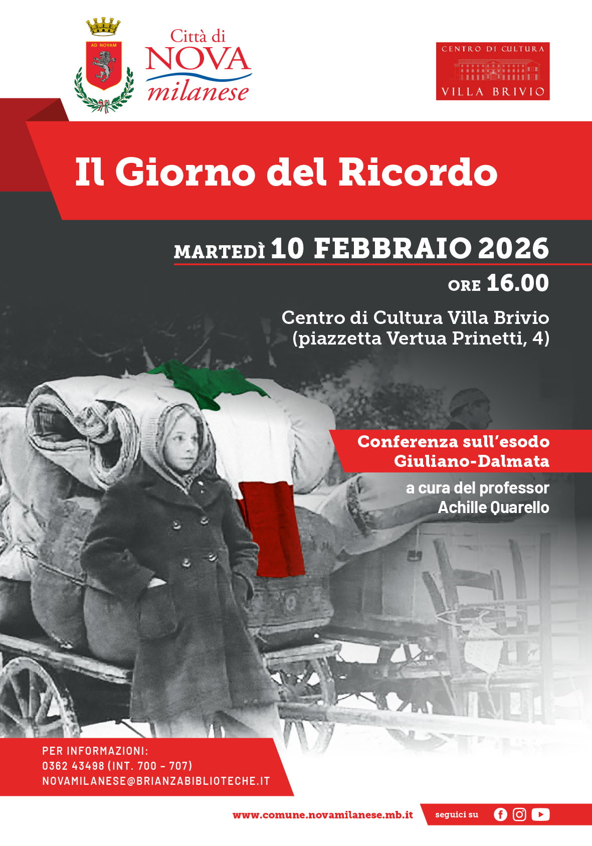In occasione del Giorno del Ricordo, martedì 10 febbraio,alle ore 16.00, presso il Centro di Cultura Villa Brivio si terrà una conferenza dedicata all’esodo Giuliano-Dalmata, a cura del professor Achille Quarello.