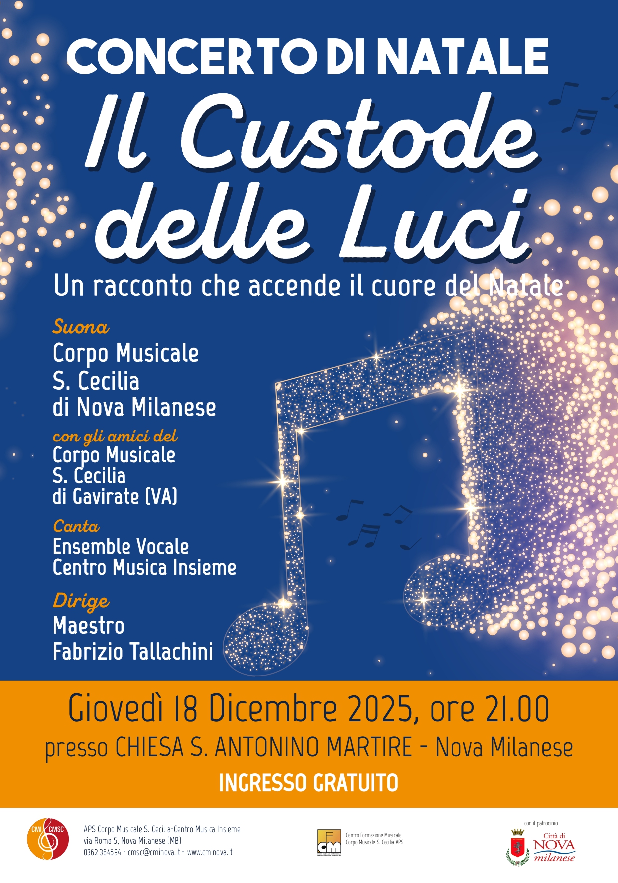 Protagonisti della serata saranno il Corpo Musicale Santa Cecilia di Nova Milanese, insieme al Corpo Musicale Santa Cecilia di Gavirate, con la partecipazione dell’Ensemble Vocale del Centro Musica Insieme. A guidare questo viaggio musicale e narrativo sarà il Maestro Fabrizio Tallacchini, che accompagnerà il pubblico attraverso un percorso fatto di emozioni, suggestioni e atmosfere natalizie.