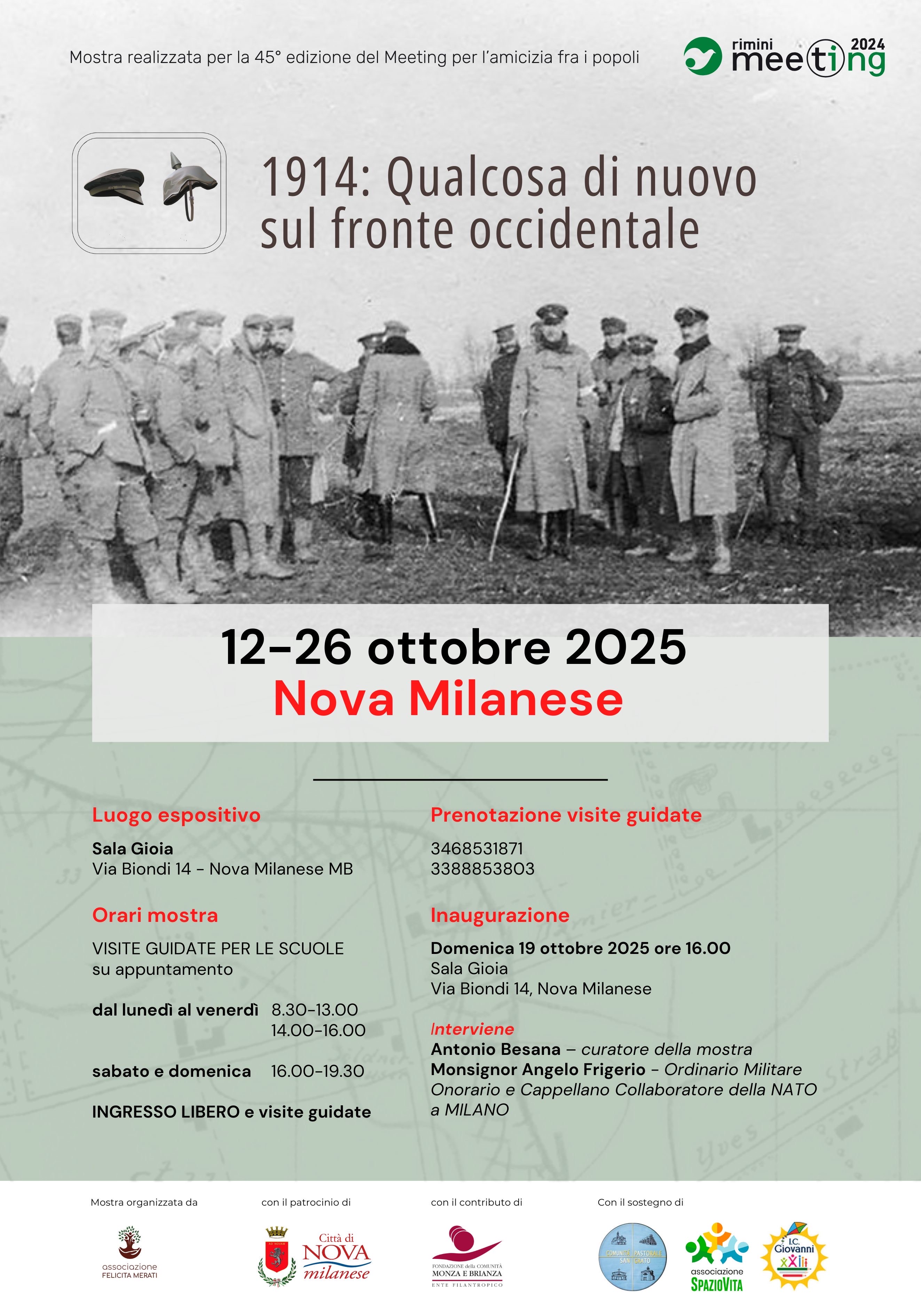L’Associazione Felicita Merati presenta la mostra "1914: Qualcosa di nuovo sul fronte occidentale", ospitata presso Sala Gioia (via Biondi 14) dal 12 al 26 ottobre, in occasione della 45ª edizione del Meeting per l’amicizia fra i popoli.