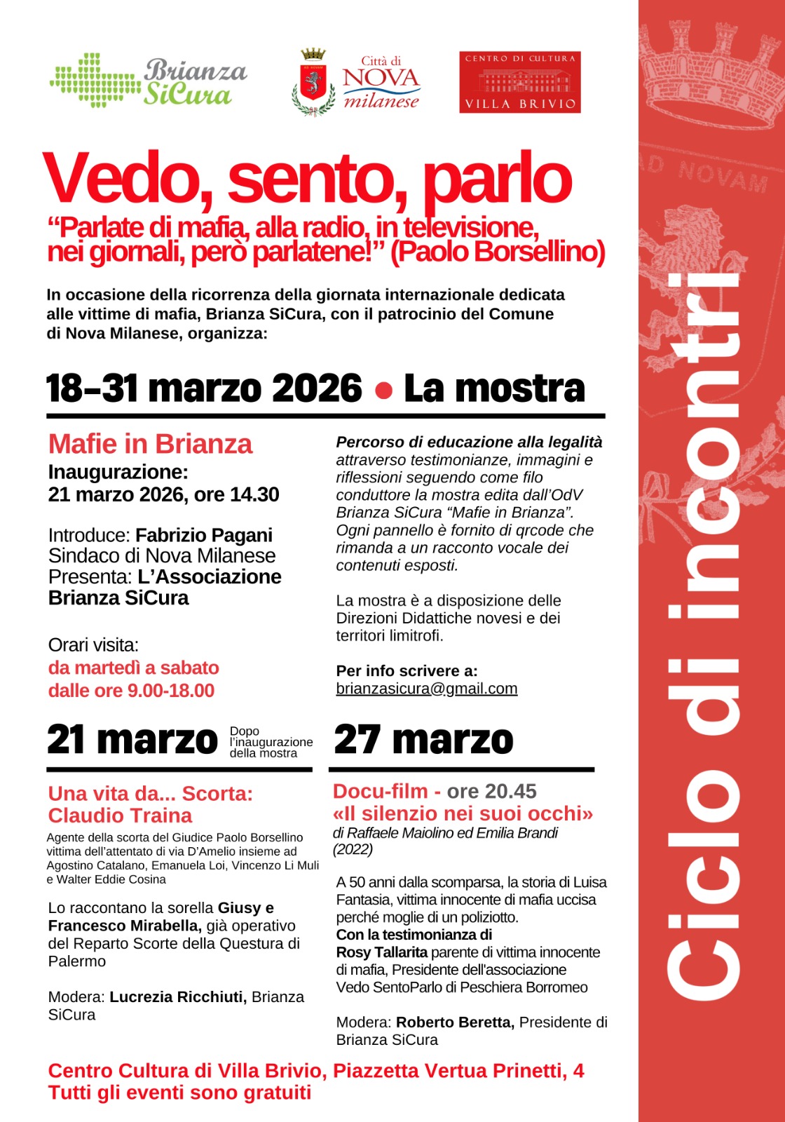 Dal 18 al 31 marzo, sarà possibile visitare presso il Centro di Cultura Villa Brivio la mostra “Mafie in Brianza”, ideata dall’OdV Brianza SiCura. La mostra propone testimonianze, immagini e riflessioni, seguendo come filo conduttore i pannelli espositivi, ognuno corredato da QR code che rimandano a racconti vocali dei contenuti.