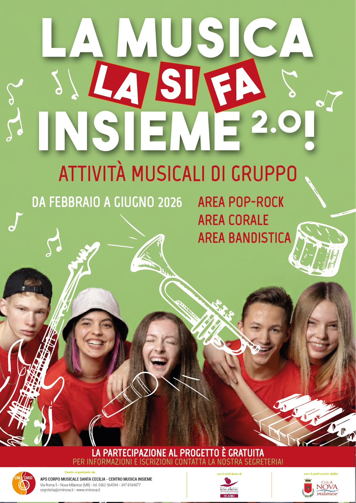 Da febbraio a giugno 2026 saranno attive tre aree di lavoro – pop-rock, corale e bandistica – per offrire l’opportunità di suonare e cantare insieme, condividendo repertori ed esperienze. Il progetto si concluderà con un evento pubblico finale a Nova Milanese, aperto alla cittadinanza.