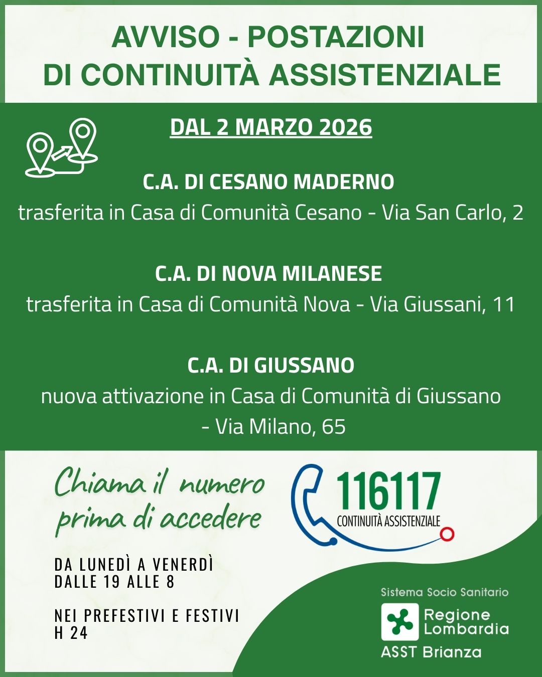 ASST Brianza informa che dal 2 marzo 2026 la postazione di Continuità Assistenziale di Nova Milanese sarà trasferita presso la Casa di Comunità di Nova Milanese, in via Giussani 11.